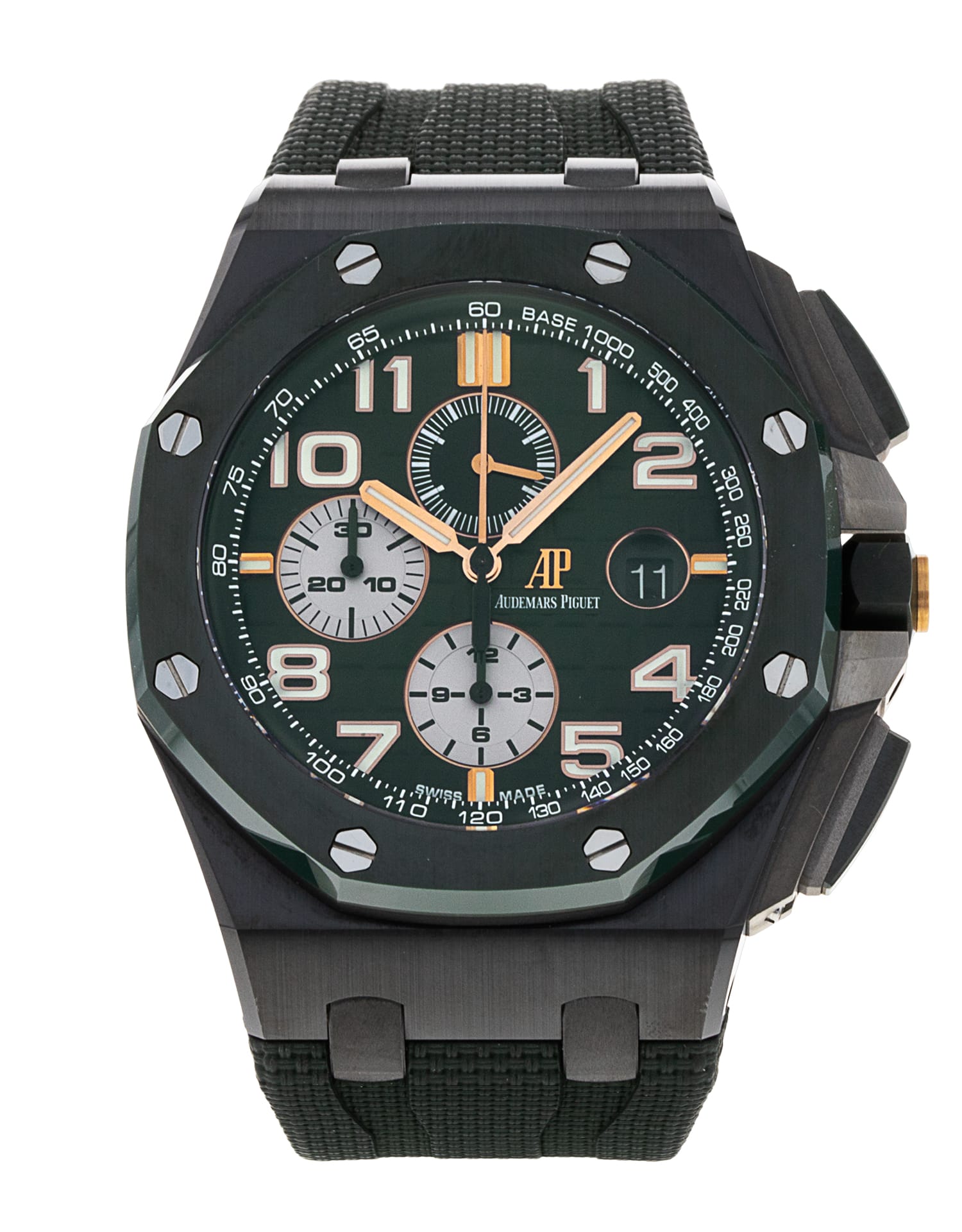 This Audemars Piguet Royal Oak Offshore 26405CE.OO.A056CA.01 has a green arabic dial and a rubber strap. This Audemars Piguet has undergone a thorough inspection of accuracy, functionality and condition at our Audemars Piguet certified service centre to determine the level of reconditioning required to meet our strict standards. It has also been checked against our records to ensure authenticity. All our watches have a 24-month warranty for your peace of mind.
