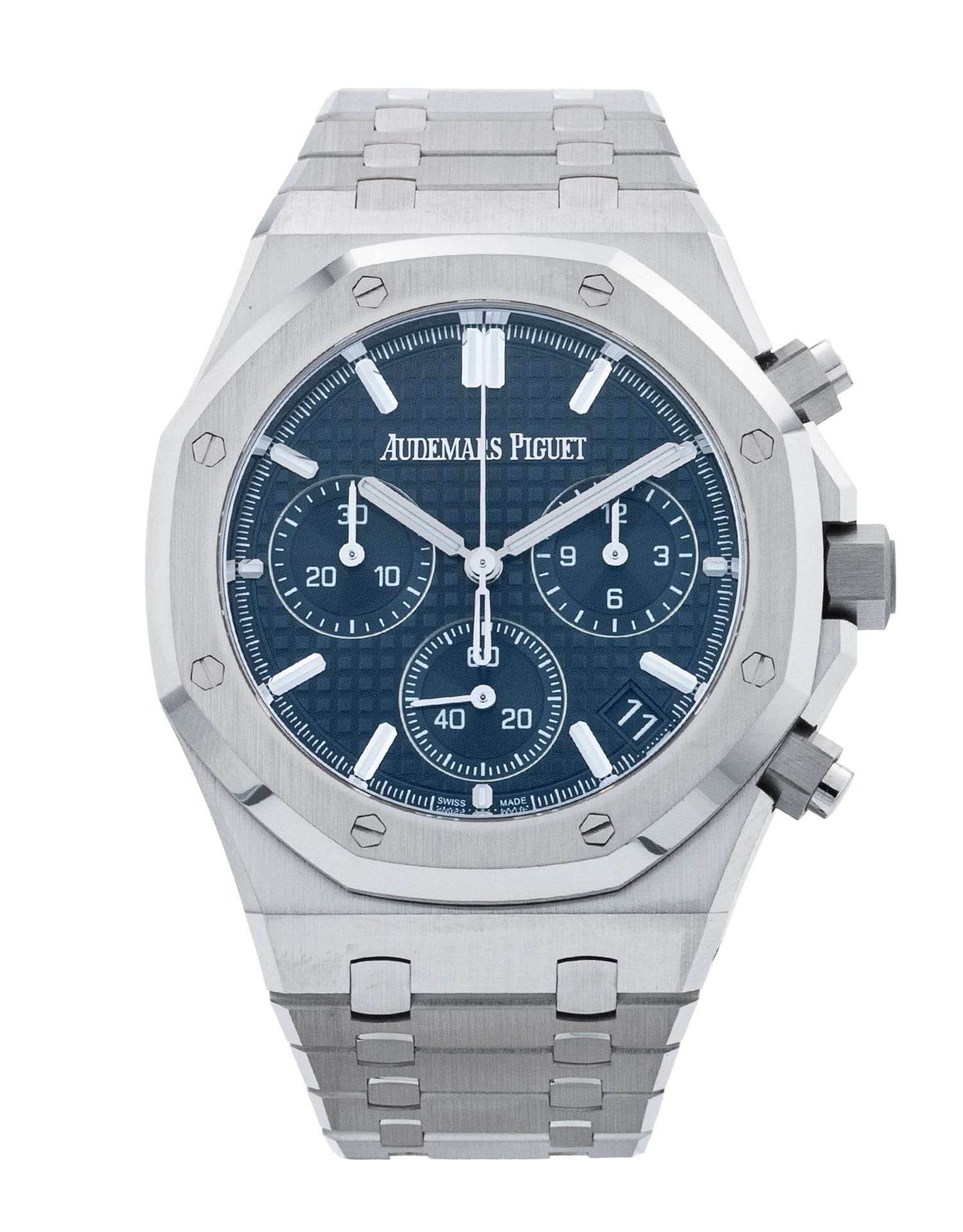 This Audemars Piguet Royal Oak 26240ST.OO.1320ST.05 has a blue dial and a bracelet strap. This Audemars Piguet has undergone a thorough inspection of accuracy, functionality and condition at our Audemars Piguet certified service centre to determine the level of reconditioning required to meet our strict standards. It has also been checked against our records to ensure authenticity. All our watches have a 24-month warranty for your peace of mind.