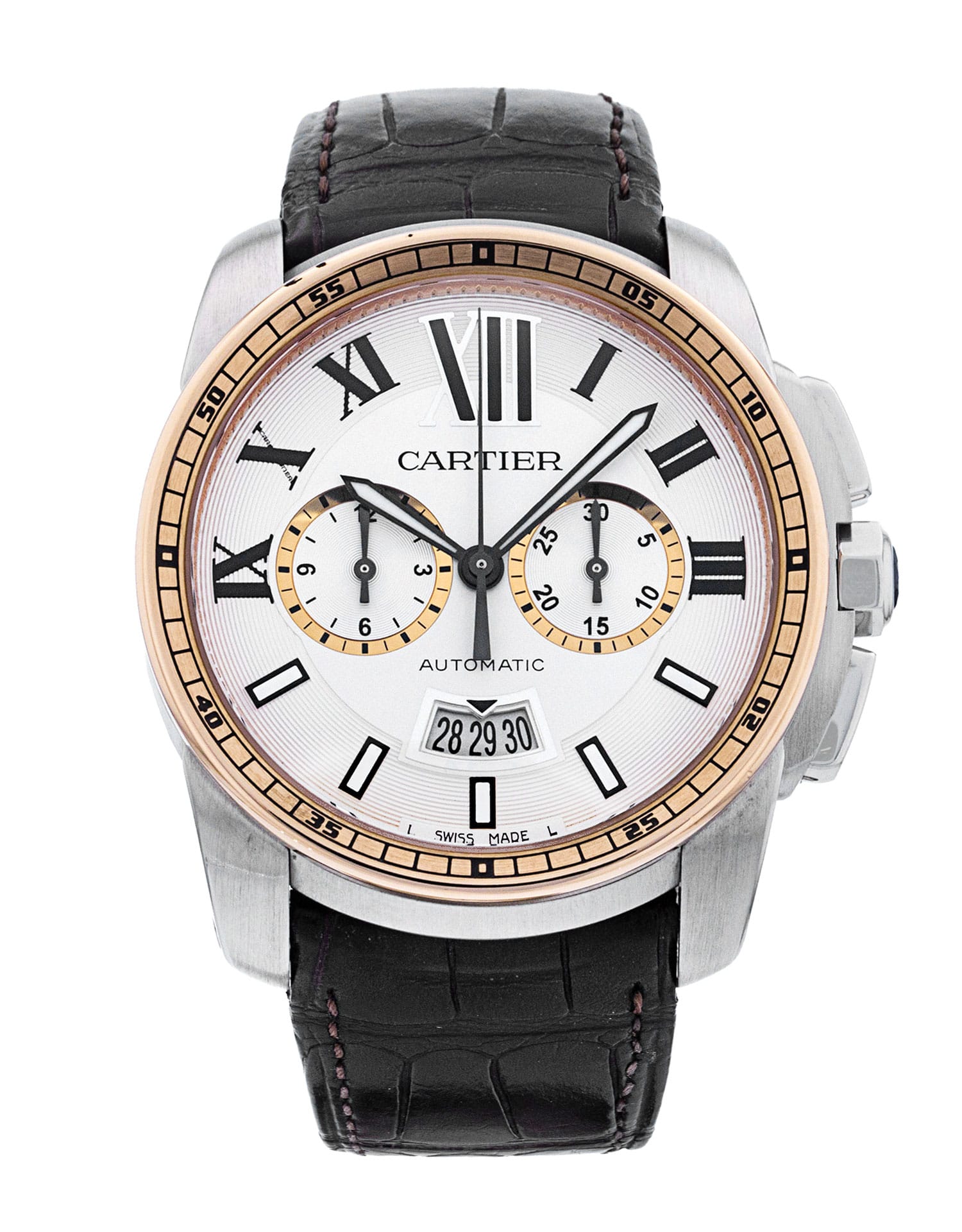 This Cartier Calibre De Cartier W7100043 has a silver roman numeral dial and a leather strap. This Cartier has undergone a thorough inspection of accuracy, functionality and condition at our Cartier certified service centre to determine the level of reconditioning required to meet our strict standards. It has also been checked against our records to ensure authenticity. All our watches have a 24-month warranty for your peace of mind.