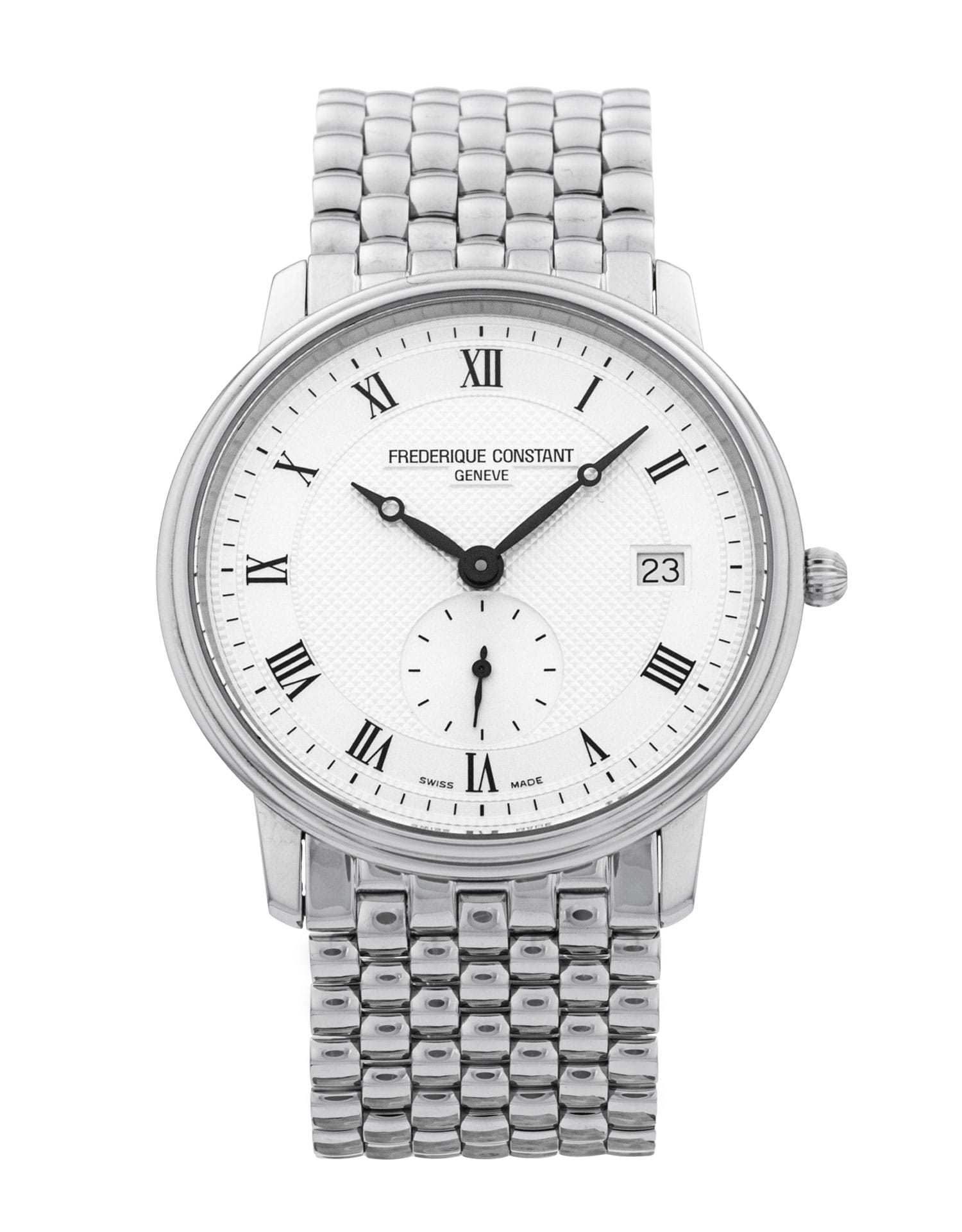 This Frederique Constant Slim Line FC-245M4S6B has a white roman numeral dial and a bracelet strap. This Frederique Constant has undergone a thorough inspection of water resistance, accuracy, functionality and condition to determine the level of reconditioning required to meet our strict standards. It has also been referenced against technical documents and manufacturer records where available to ensure authenticity and a clean history. All our watches have a 24-month warranty for your peace of mind.