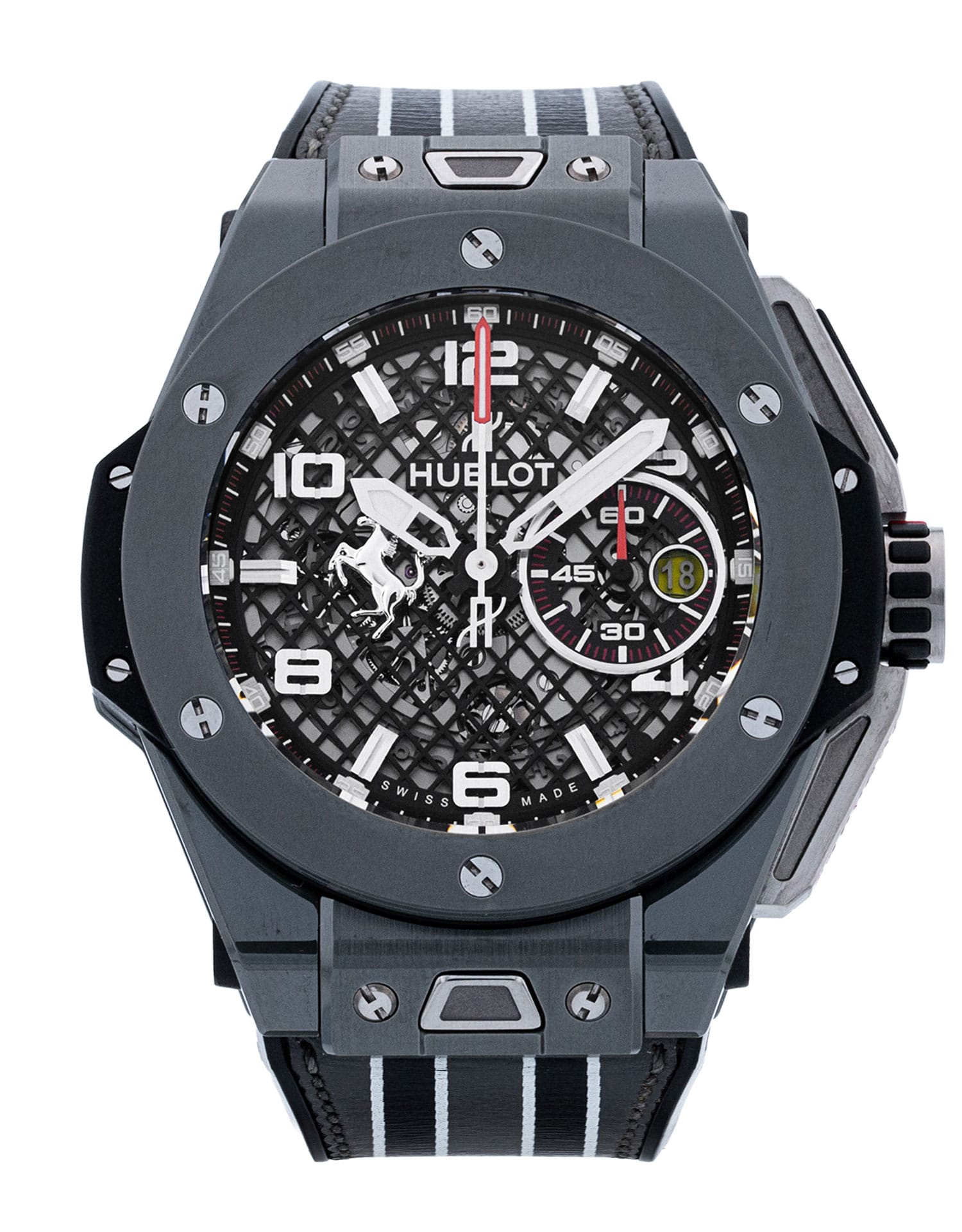 This Hublot Big Bang 401.FX.1123.VR has a skeleton dial and a leather strap. This Hublot has undergone a thorough inspection of water resistance, accuracy, functionality and condition to determine the level of reconditioning required to meet our strict standards. It has also been referenced against technical documents and manufacturer records where available to ensure authenticity and a clean history. All our watches have a 24-month warranty for your peace of mind.