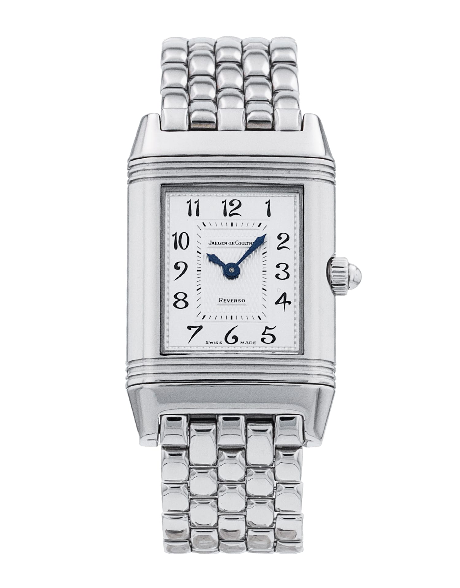 This Jaeger-LeCoultre Reverso Duetto 2668110 has a white arabic dial and a bracelet strap. This Jaeger-LeCoultre has undergone a thorough inspection of accuracy, functionality and condition at our Jaeger-LeCoultre certified service centre to determine the level of reconditioning required to meet our strict standards. It has also been checked against our records to ensure authenticity. All our watches have a 24-month warranty for your peace of mind.