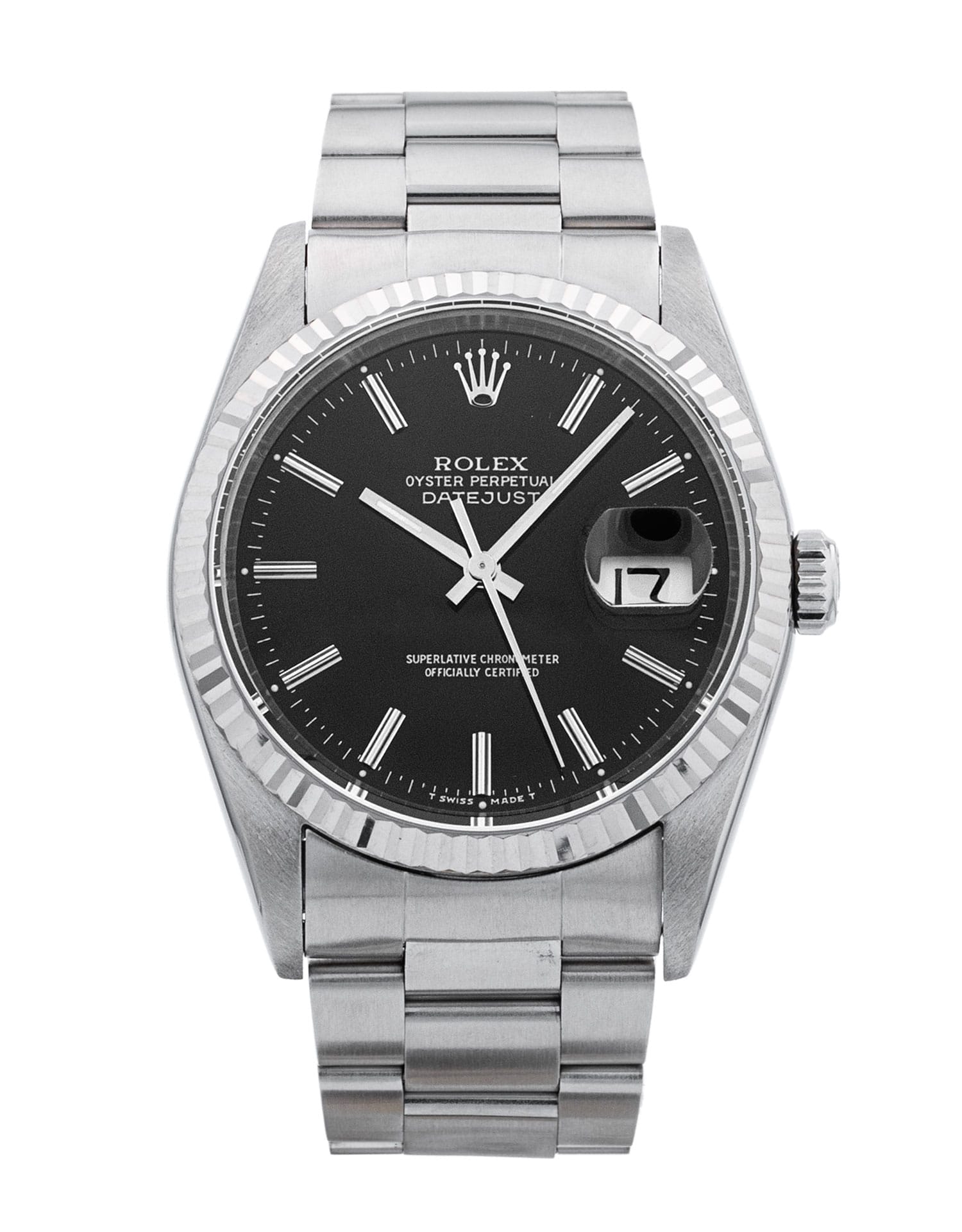 This Rolex Datejust 16234 has a black baton dial and a bracelet strap. This Rolex has undergone a thorough inspection of water resistance, accuracy, functionality and condition to determine the level of reconditioning required to meet our strict standards. It has also been referenced against technical documents and manufacturer records where available to ensure authenticity and a clean history. All our watches have a 24-month warranty for your peace of mind. One of our skilled polishing technicians has removed marks on the case and bracelet of this watch, brought about by daily wear and tear, which is why this watch does not come with the remaining manufacturer’s warranty.