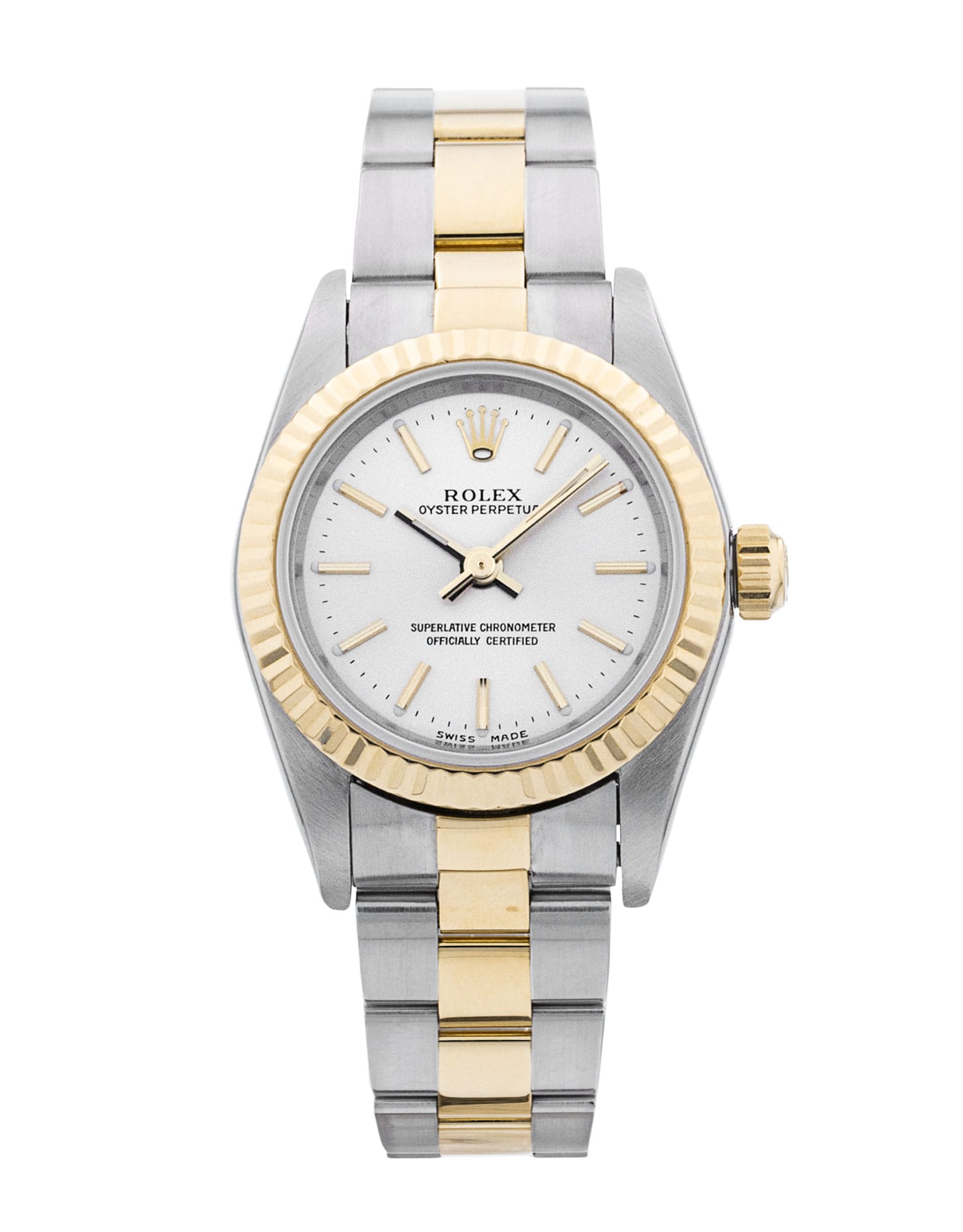This Rolex Lady Oyster Perpetual 76193 has a silver baton dial and a bracelet strap. This Rolex has undergone a thorough inspection of water resistance, accuracy, functionality and condition to determine the level of reconditioning required to meet our strict standards. It has also been referenced against technical documents and manufacturer records where available to ensure authenticity and a clean history. Our watches have a 24-month warranty for your peace of mind, in conjunction with any remaining manufacturer’s warranty from new or from service. To maintain the manufacturer’s warranty on this watch, it has not been polished in our service centre.