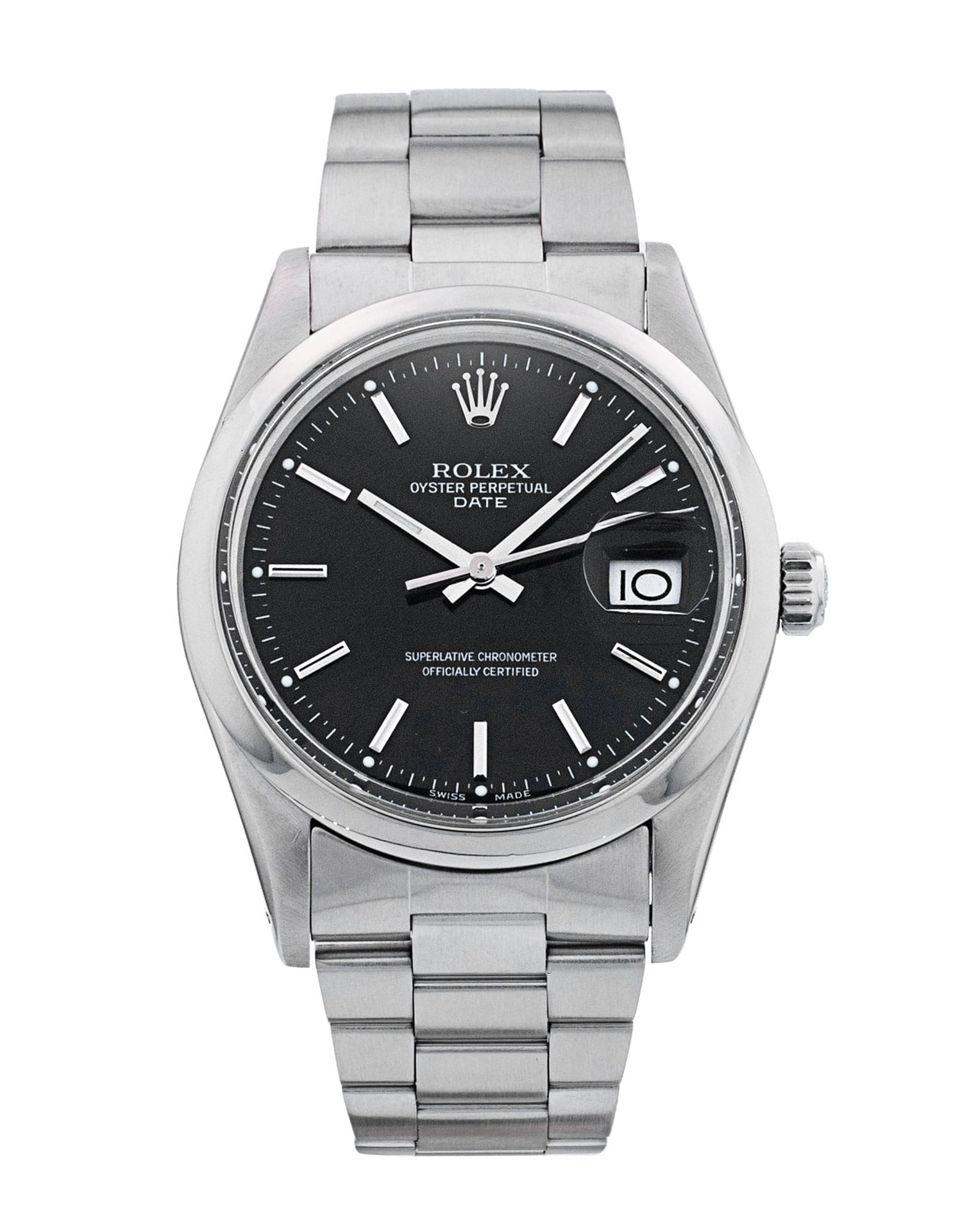 This Rolex Oyster Perpetual Date 1500 has a black baton dial and a bracelet strap. This Rolex has undergone a thorough inspection of accuracy, functionality and condition to determine the level of reconditioning required to meet our strict standards. It has also been referenced against technical documents and manufacturer records where available to ensure authenticity and a clean history. All our watches have a 24-month warranty for your peace of mind. One of our skilled polishing technicians has removed marks on the case and bracelet of this watch, brought about by daily wear and tear, which is why this watch does not come with the remaining manufacturer’s warranty.