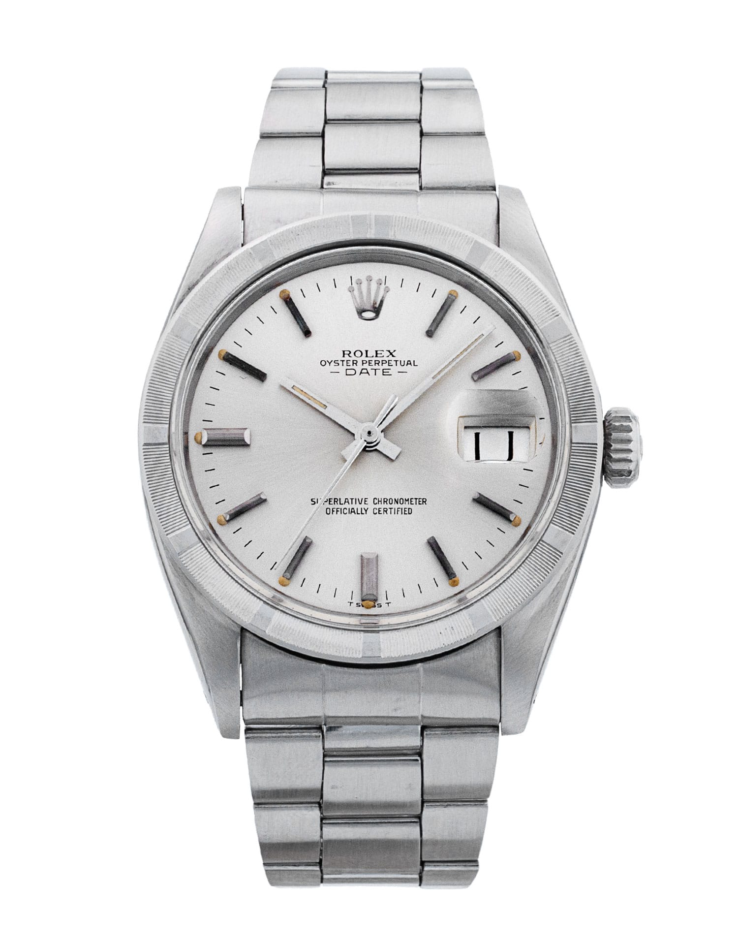 This Rolex Oyster Perpetual Date 1501 has a silver baton dial and a bracelet strap. This Rolex has undergone a thorough inspection of accuracy, functionality and condition to determine the level of reconditioning required to meet our strict standards. It has also been referenced against technical documents and manufacturer records where available to ensure authenticity and a clean history. All our watches have a 24-month warranty for your peace of mind. One of our skilled polishing technicians has removed marks on the case and bracelet of this watch, brought about by daily wear and tear, which is why this watch does not come with the remaining manufacturer’s warranty.